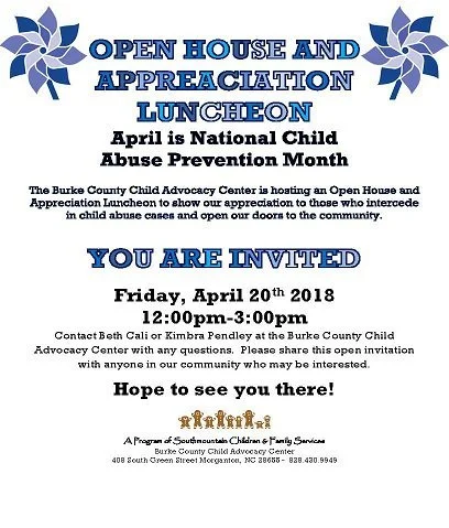 Open House Friday, April 20, 2018 12:00 p.m. to 3:00 p.m. Contact Beth Cali or Kimbra Pendley at the Burke County Child Advocacy Center with any questions. Please share this open invitation with anyone in our community who may be interested. Burke County Child Advocacy Center 408 South Green Street Morganton, NC 28655 ~ (828) 430-9949